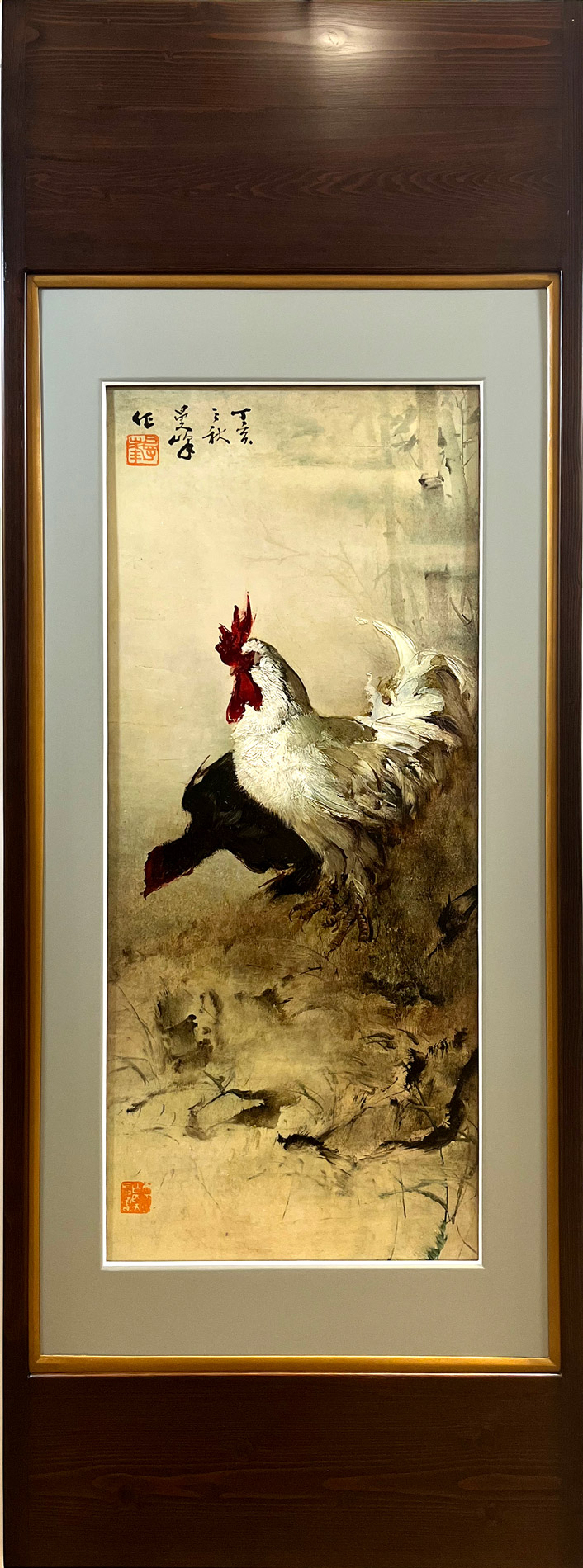 In Rooster and Hen Lee Man Fong presents with elegant restraint a simple, timeless pairing: a proud rooster and a companion hen, depicted with refined observation and painterly subtlety. Executed in 1947, this work belongs to a formative period when the artist was locating his own visual language — one at once rooted in Chinese brush-painting sensitivities and attuned to Western oil-painting technique. The narrow vertical format emphasises the upright cadence of the rooster's stance, while the soft tonalities of the background allow the white, red and earth-toned feathers to assert rich presence without theatricality.