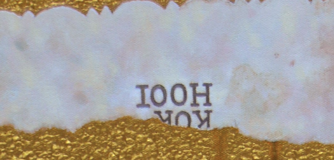 The figure stands frontal, arms crossed, suspended between assertion and vulnerability. The "new clothes" are not garments at all, but symbols—printed directly onto the skin—suggesting how identity in the modern age is increasingly worn as surface. Fame, status, and desire adhere to the body like a second skin, yet remain fundamentally impermanent. Chan's deliberate aging of the image reminds us that while materials decay—paper yellows, surfaces crack—the immaterial residue of memory, aspiration, and spirit lingers, unresolved.