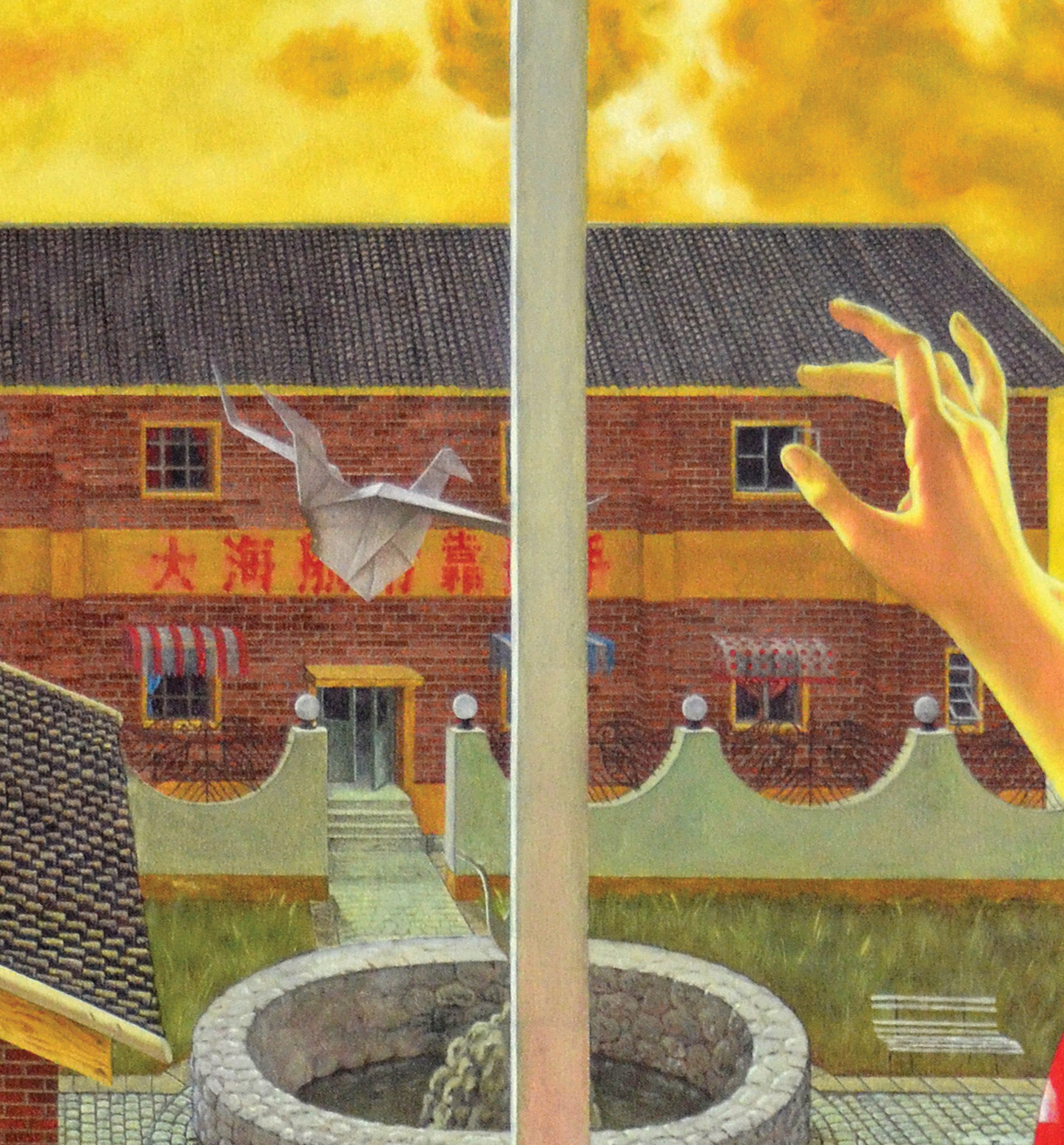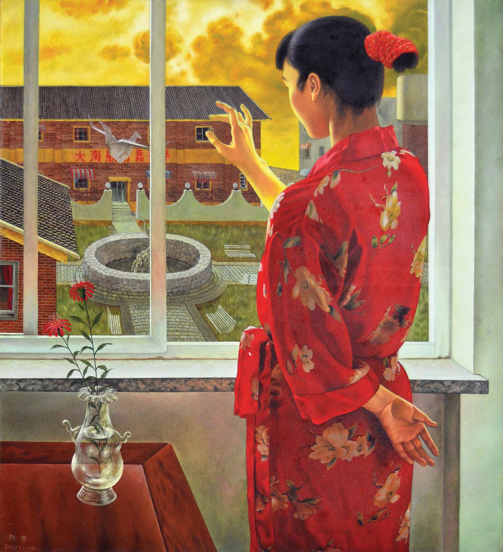 The viewpoint places the viewer just behind the figure, close yet detached. Her raised hand, held mid-gesture, introduces a quiet sense of movement and uncertainty. Outside, a drifting paper bird suggests freedom and fragility, while the circular stone well below echoes the enclosed interior space, strengthening the painting's visual harmony.