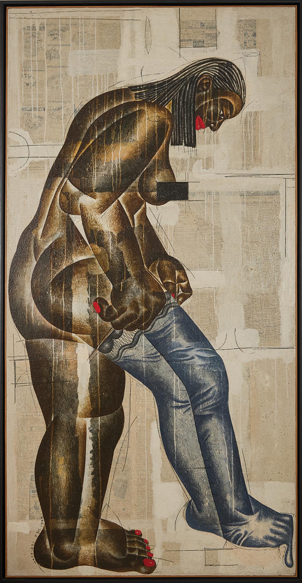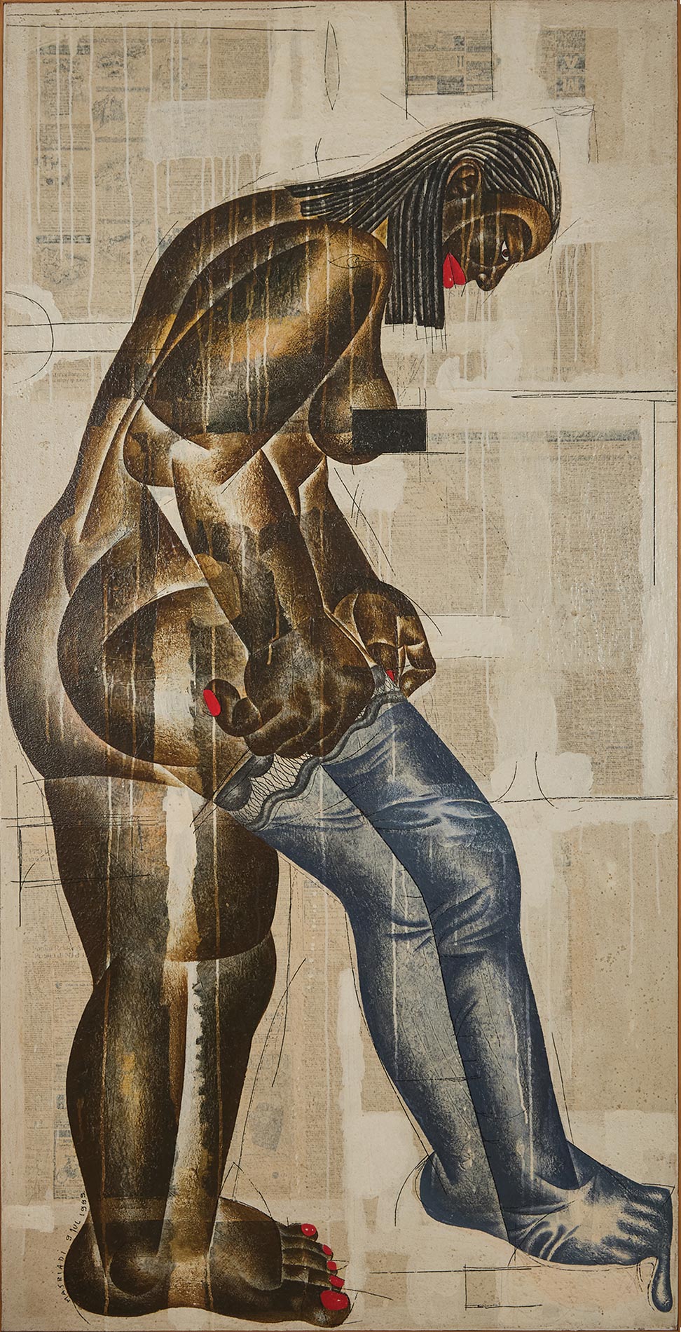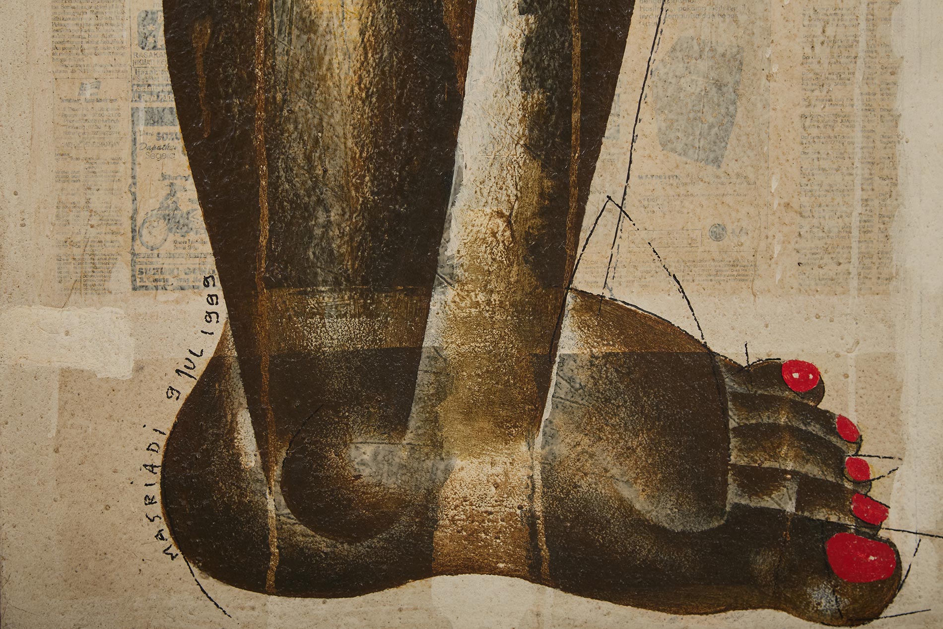 Dominating the composition is a monumental female figure, rendered with exaggerated musculature and sculptural weight. Her body, both sensual and imposing, bends forward in a moment of private routine—pulling on a stocking. This seemingly mundane act is transformed into a striking psychological scene, where vulnerability and strength coexist with arresting intensity. Masriadi's signature distortion is already present, amplifying the human form into something at once grounded and mythic.