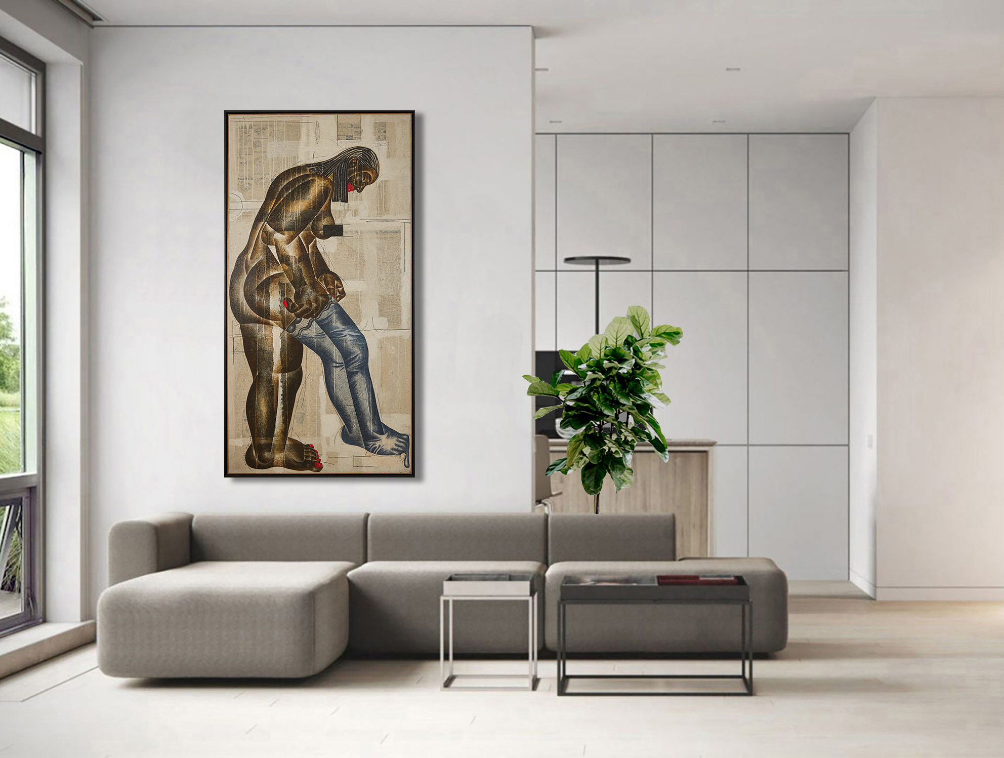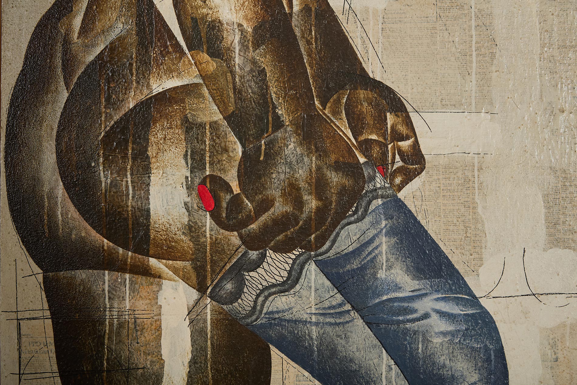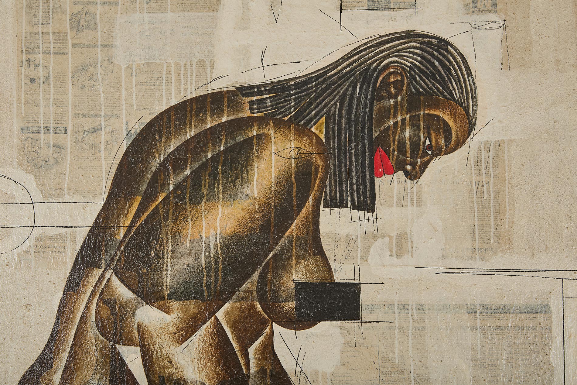 The surface is richly layered. The use of mixed media—particularly the integration of newspaper textures—introduces a gritty, urban sensibility that contrasts with the polished illusion of the figure. This interplay between material and image creates a compelling tension, suggesting themes of modern identity, media saturation, and the constructed nature of self.