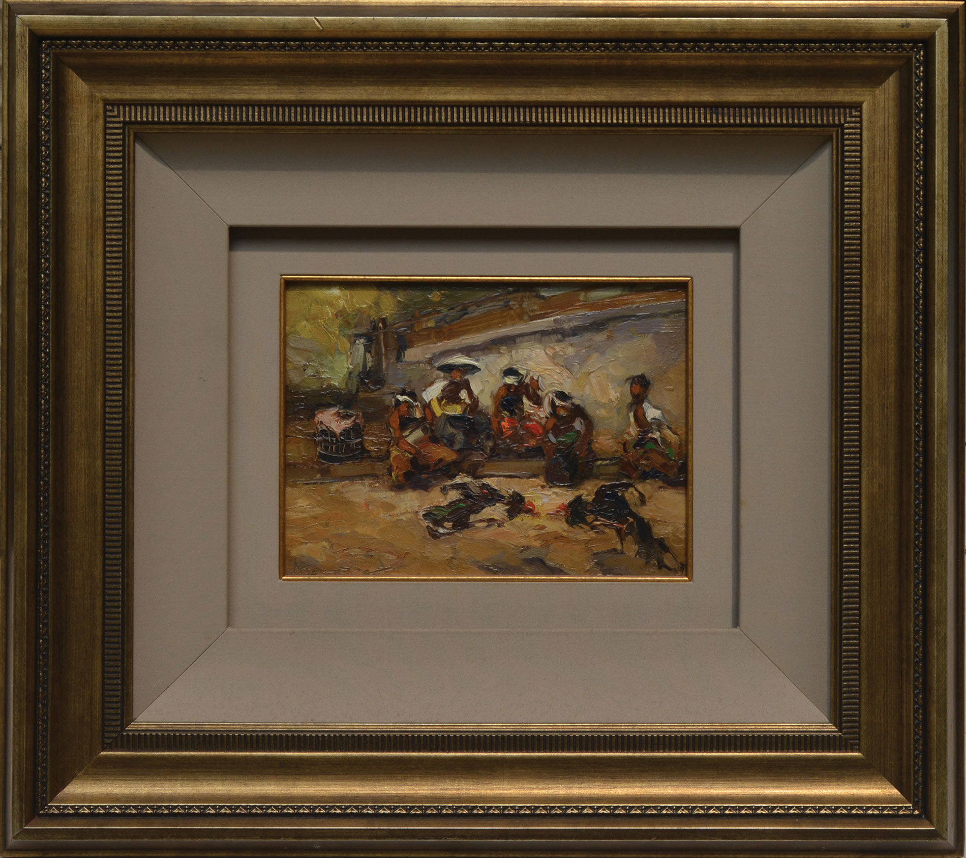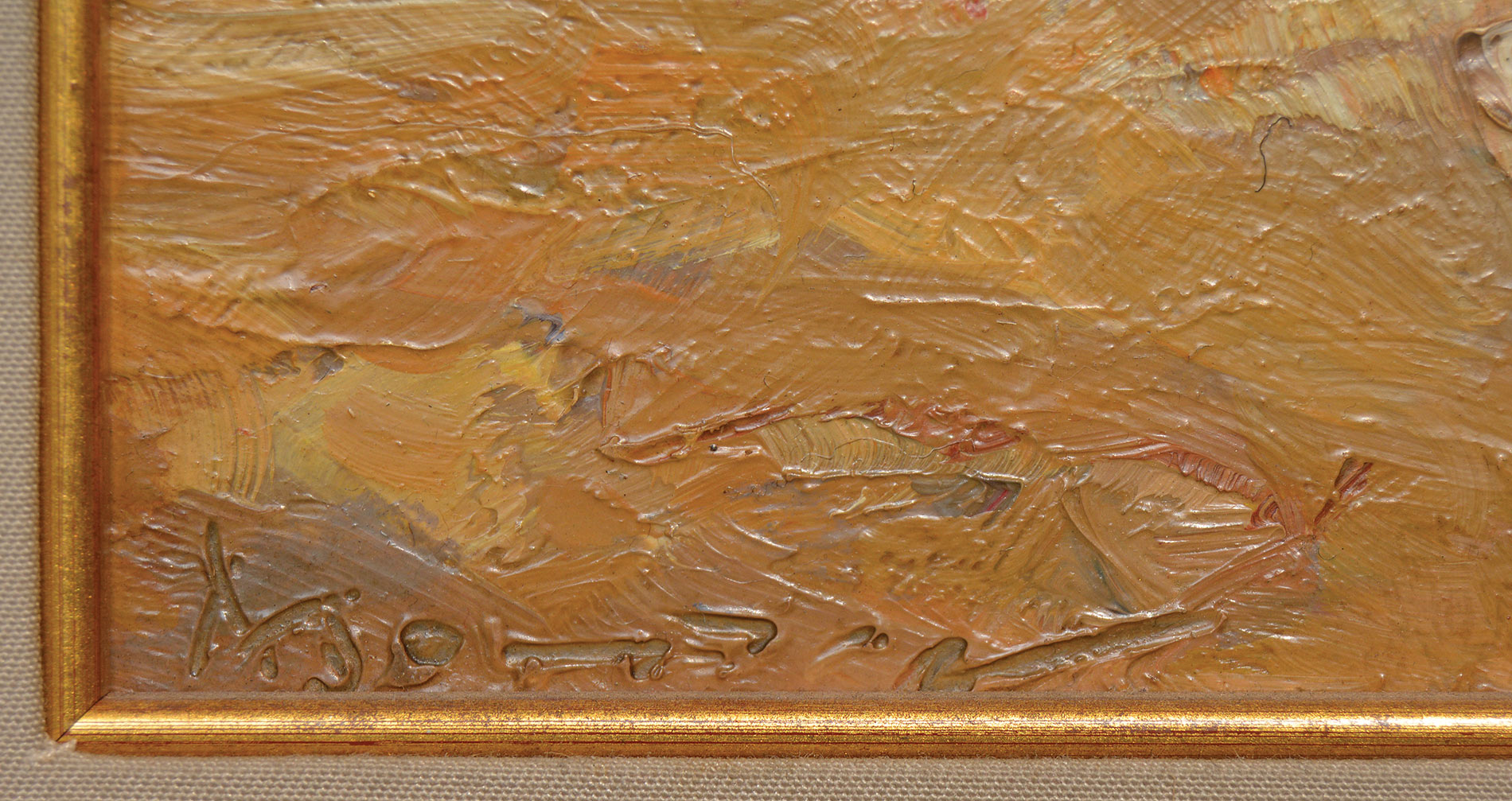 The painting is in good condition. Board is also in good condition. No retouching was detected upon examination under ultraviolet light. Paint layers are intact and in stable condition. The painting is offered with frame.