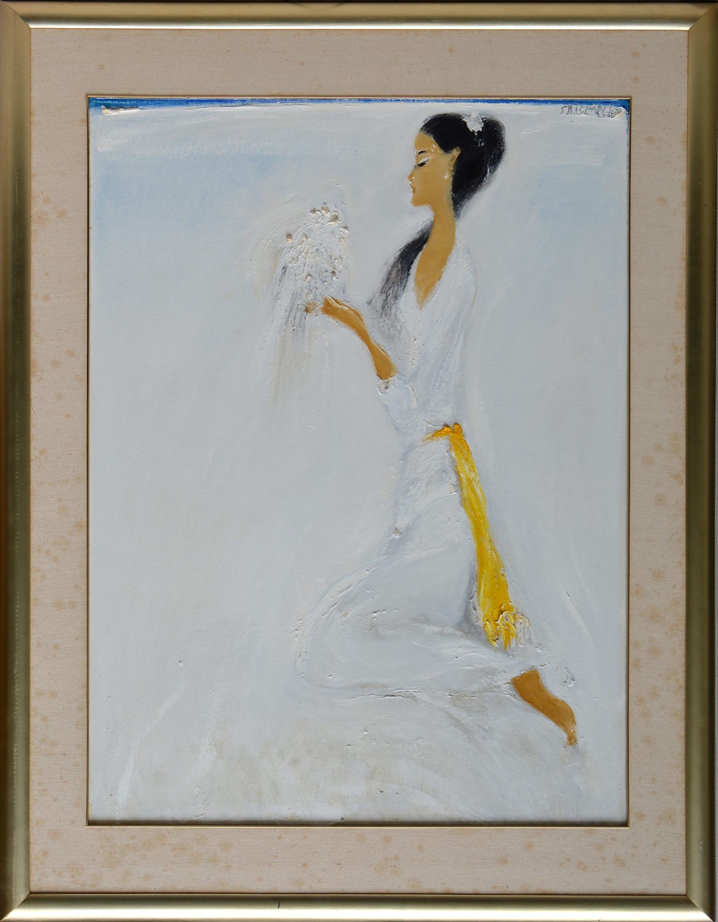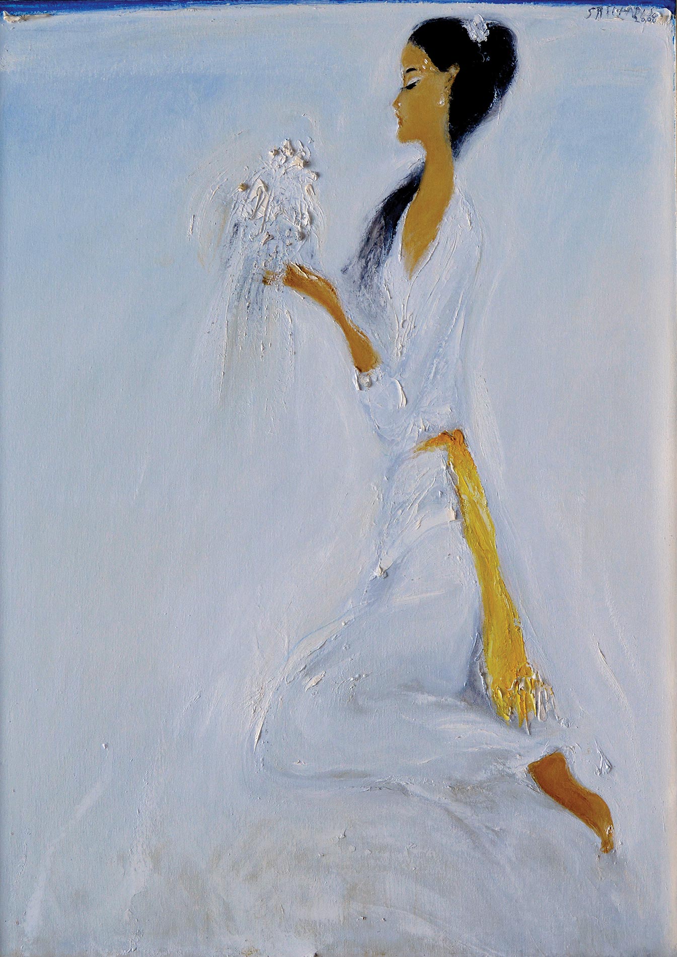 The woman's profile—calm, graceful, and introspective—anchors the composition with a profound sense of inner stillness. Her hands, delicately offering a bouquet-like form, evoke devotion, gratitude, and purity. Srihadi's characteristic palette of whites and pale tones dissolves boundaries, merging figure and space into a unified field of contemplation. Against this tranquil harmony, the stroke of yellow wrapped around her waist glows like a quiet flame—an affirmation of life, joy, and spiritual radiance.